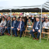 • burmistrz z księdzem odbierają wieniec dożynkowy od jednej z delegacji