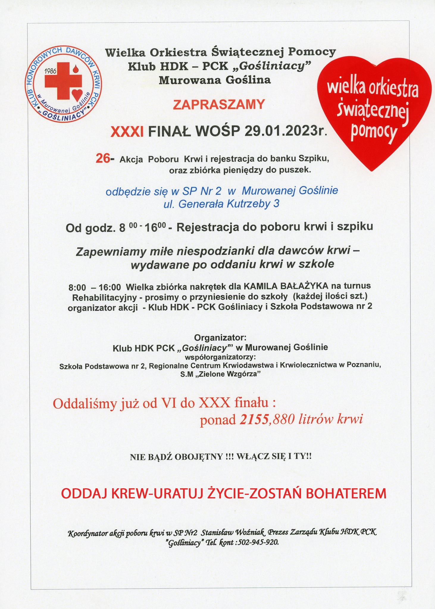 8:00 - 16:00 Akcja honorowego oddawania krwi i rejestr do banku szpiku Klub HDK PCK „Gośliniacy” i RCKK w Poznaniu.